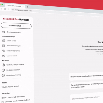 Rocket Pro Navigate: turning answers into actionNavigate is not just a quick-answer tool. It is designed exclusively for loan officers to take action in every step of their daily workflows. Unlike other AI tools, Navigate turns insights into actionable steps, so you can move deals forward, communicate faster, and spend less time in your inbox.